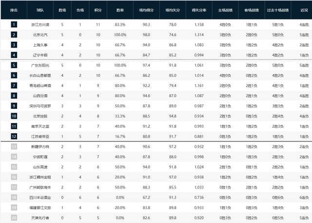 黑馬吉林隊本輪延續(xù)火熱狀態(tài),在缺少超級球星的情況下,他們憑借團隊籃球取得一波四連勝,目前以4勝2負的戰(zhàn)績排名積分榜第六位,表現(xiàn)令人驚喜。另一匹黑馬青島隊和山西隊同以4勝1負的戰(zhàn)績分列第七和第八位,但兩隊均少賽一輪,排名稍顯吃虧。