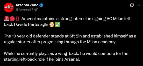 據(jù)意大利《米蘭體育報(bào)》報(bào)道,阿森納在一月轉(zhuǎn)會(huì)窗開啟前已對(duì)AC米蘭后衛(wèi)巴爾泰薩吉產(chǎn)生了濃厚興趣。槍手希望這個(gè)冬天把這位邊后衛(wèi)帶到英格蘭。對(duì)槍手而言,這是一筆面向未來的精明投資,可在未來數(shù)年逐步培養(yǎng)。巴爾泰薩吉主打左后衛(wèi),喜歡上下翻飛,必要時(shí)參與進(jìn)攻,將與卡拉菲奧里、劉易斯-斯凱利等人競爭主力位置。