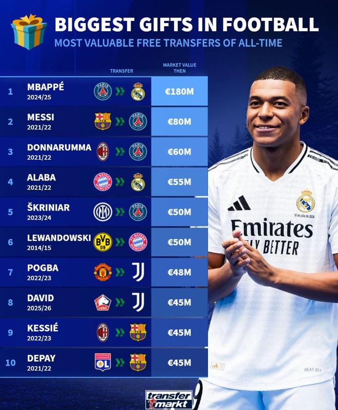 北京時間12月26日,德轉(zhuǎn)列出了歷史免簽球員身價榜,去年夏天從巴黎圣日耳曼自由轉(zhuǎn)會皇家馬德里的姆巴佩以1.8億歐元高居第一,2021年從巴塞羅那轉(zhuǎn)投巴黎圣日耳曼的梅西8000萬歐元位列第二。