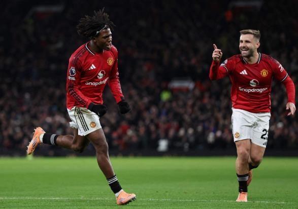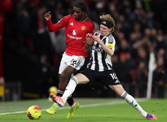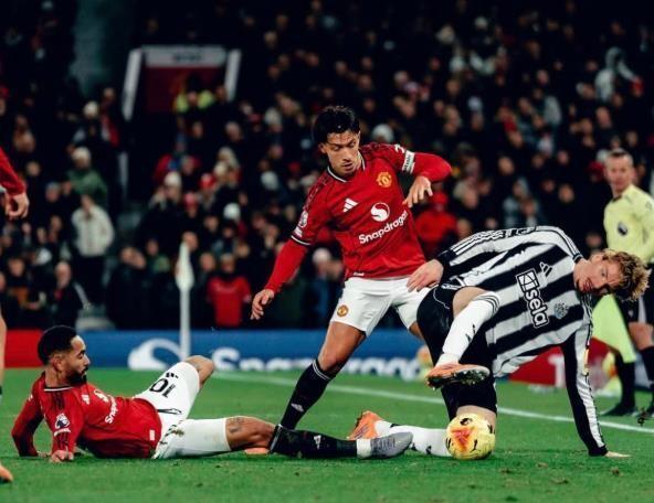 本場(chǎng)比賽,曼聯(lián)面臨嚴(yán)重人員不齊的問(wèn)題,姆伯莫、馬茲拉維、阿瑪?shù)?、B費(fèi)、馬奎爾、德里赫特等六名主力因?yàn)閰⒓臃侵薇褪艿絺∮绊憻o(wú)法出戰(zhàn),主帥阿莫林不得不啟用多名年輕球員。膠著的局面在第24分鐘被打破,曼聯(lián)前場(chǎng)擲出界外球到紐卡禁區(qū),一片混亂后,多爾古迎球凌空抽射,皮球如出膛炮彈直掛網(wǎng)窩,這位20歲小將斬獲曼聯(lián)一線隊(duì)首球,也成為曼聯(lián)節(jié)禮日最年輕的進(jìn)球者之一。